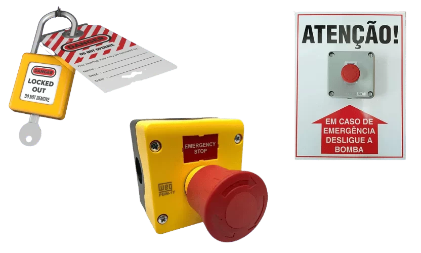 - Dispositivos de segurança (botões de emergência, proteções de partes móveis).